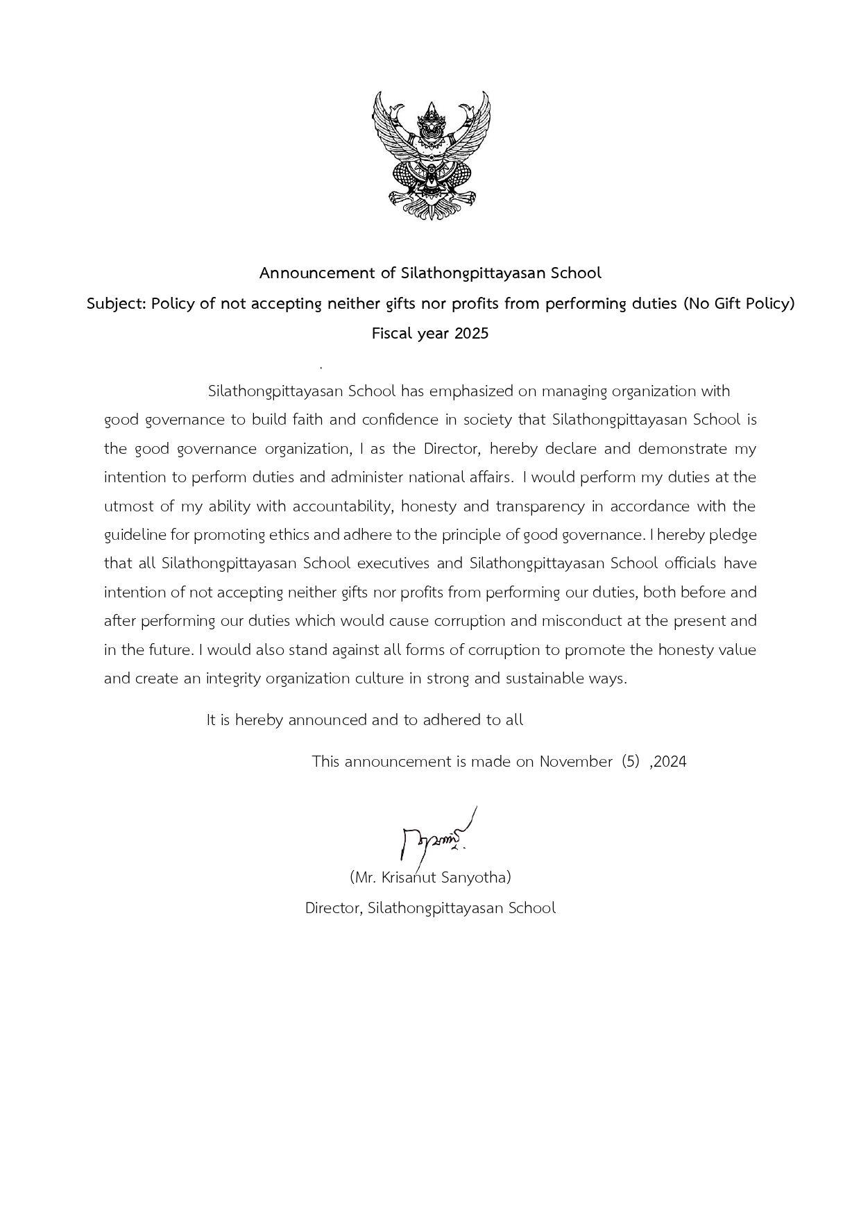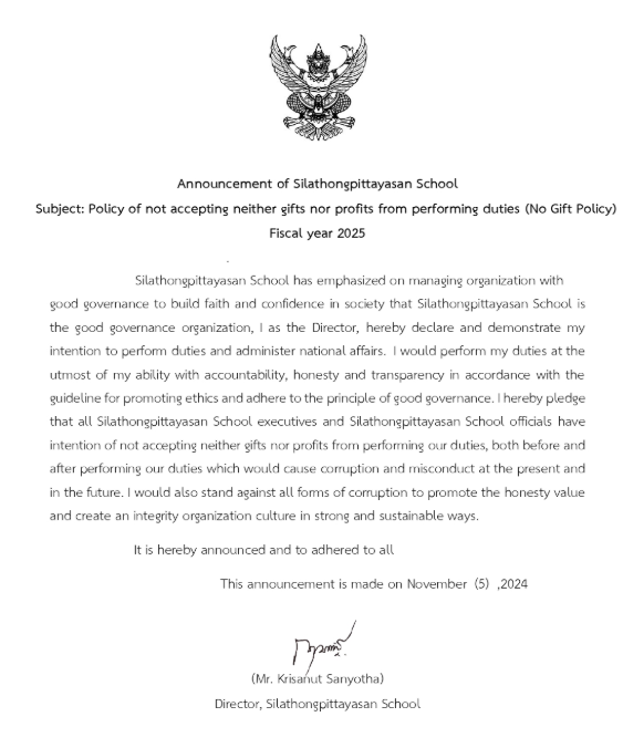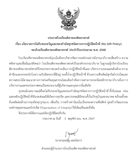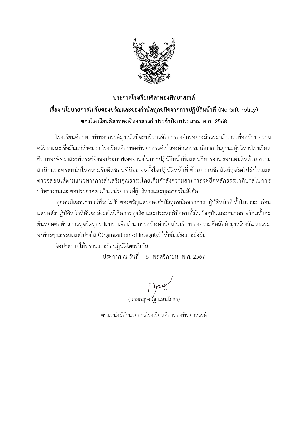 ประกาศเจตนารมณ์และการสร้างวัฒนธรรม ตามนโยบาย No Gift Policy จากการปฏิบัติหน้าที่